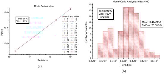 Analysis from the circuit using Monte Carlo simulations are shown in Figure 8. The simulation was carried out using the Monte Carlo models included in the UMC 0.18 m Mixed-Mode 1.8 V CMOS Process, therefore all the process variables of the NMOS and PMOS transistors was into account. The standard deviation at sigma level for Monte Carlo simulation was set to Sigma = 3, recommended by the foundry. The output period versus resistance for each Monte Carlo run (index = 30) is shown in Figure 8a. The foundry establishes that, if the circuit operates correctly for all 30 iterations, there is 99% probability that over 80% of all possible component values operated correctly. To ensure the correct operation of the converter, a Monte Carlo analysis with an index equal to 100 at the worst case ( K, Temperature = 95 C, V) was made and the result is shown in Figure 8b. The Monte Carlo analysis showed a relative deviation of the Period of around 1.5% due to the process variation, taking two standard deviations around the average. This shows the robustness of the system to process variations without the use of bandgap circuits and therefore without compromising power consumption, area and complexity in the design of R-T converters using the proposed architecture.