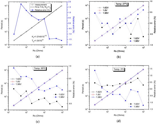 In Figure 10c,d, the response and relative error of the R-T converter when exposed to supply voltage variations at the worst cases of temperature 95 C and 3 C, respectively, are shown. The relative error with respect to the nominal period value at 27 C remains into ±1.5%.