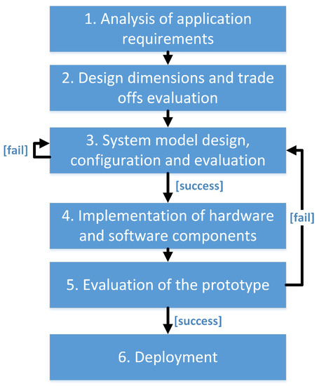 The general methodology for the development of embedded applications and specifically its application towards the design of the wireless sensor network (WSN) solutions have been discussed in [53,54], respectively. The traditional design flow consists of six phases, depicted in Figure 1 [54]: