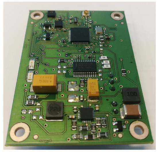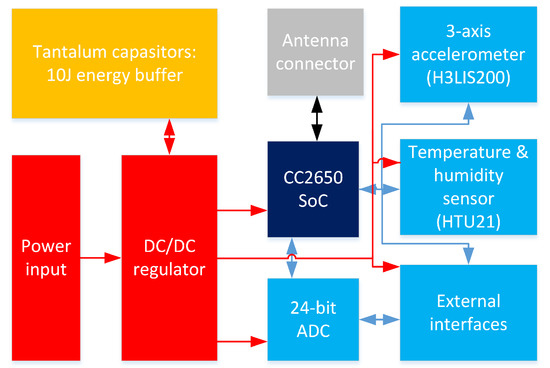 Finally, the proper selection of the sensors and other peripherals is of extreme importance. Based on the discussion above, for our implementation, we selected a sensor node from Solmu Technologies (Oulu, Finland) [62] designed and optimized specifically for energy-harvesting powered operation. A node (depicted in Figure 3, the structure is shown in Figure 4) has in its core a multi-radio-technology-enabled system-on-chip based on 32-bit Advanced RISC Machine (ARM) controller (consuming 100 nA in shut down and below 3 mA operating with a clock of 40 MHz). To enable the energy harvesting supply, the node is equipped with a DC–DC converter, which can convert an input voltage from 0.1 V to over 5 V to a stable DC voltage in the range from 2 to 3.6 V. Importantly, having the ten A current on its input, the converter demonstrates the efficiency of over 80%. As the energy buffers, the tantalum capacitors storing up to 10 J of energy storage in total are used. A sensor node also has the place for a single CR2032 lithium battery, which can be used as an alternative or a backup power source option. The node is equipped with an instrumental-grade external analog-to-digital converter and with low-consuming environment sensor (i.e., temperature and humidity) and three-axis acceleration sensors.