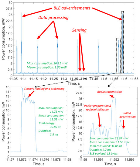 For this node, we have developed the firmware, making the sensor node measure the acceleration, process it (i.e., calculate the Fast Fourier transform (FFT) to estimate the speed of rotation) and the temperature, and send them twice a second in BLE advertisements. The practical energy consumption profile of the node for this specific application, which was measured with an Agilent N6705 power analyzer (Santa Clara, CA, USA) and then visualized in MATLAB, is depicted in Figure 5. The data processing and communication phases, and the key numbers related to the consumption are shown in the picture. One can see that the mean power required for stable operation of the system is 1.36 mW.