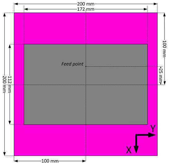 Given the geometry of our target application setup, the use of directive antennas is reasonable. The conducted market analyses have shown that no directive 868 MHz band commercial antennas are available. Due to this reason, we designed and prototyped our own linearly-polarized patch antenna, layout, and dimensions, which are illustrated in Figure 6. The reason for us basing our design on the patch antenna was twofold. First, this type of antenna is known to feature higher directivity than the dipoles. At the very same time, these antennas are still sufficiently simple and technological for mass-scale production.