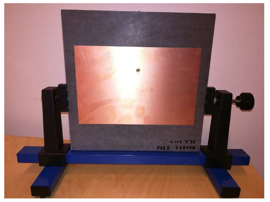 The designed antenna was first simulated in SW, and then two pieces have been manufactured using a low loss Rogers RT5880 substrate (, loss ) with 3.1 mm substrate thickness and a 35 m copper cladding. The dimensions of the ground plane are 200 × 200 mm2 and the dimensions of the radiator are 172 × 112 mm2. A large ground plane surface increases the antenna size but also enables a more directive beam and makes the characteristics of the antenna less dependent on mounting location and environment. This makes the antenna better fit our targeted environment. The 50 Ohm coaxial line is used to feed the antenna. One of the manufactured antennas is depicted in Figure 7.