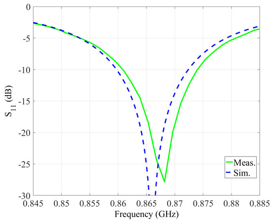 The simulated and measured values of S11 parameter and the radiation pattern of the designed antenna, demonstrating its performance, are depicted in Figure 8 and Figure 9, respectively. The resulting efficiency of the designed antenna, defined as the power radiated over a sphere compared to the power delivered to the antenna port, is on the order of 87–98% for the 860–870 MHz band. The maximum antenna gain is 7.55 dB at 865 MHz, and the width of the beam (according to the 3 dB level) is 75 degrees.