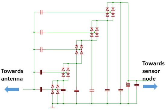 Second, one has to decide the architecture and the number of stages in the rectifying circuitry. Some of the possibilities are reported and discussed, e.g., in Ref. [11]. Importantly, the number of stages needs to be specified based on the expected range of the input radio signal’s power. Specifically, more stages enable collecting the energy from weaker signals, but at the same time introduce some losses which affect the efficiency of the system when harvesting the power from stronger signals. In addition, the more stages increase the dimensions and the price of the system. The former challenge can be addressed by employing a multi-path or switching rectifiers (e.g., the ones proposed in Ref. [65]); nonetheless, this makes the design of a rectifier even more complex and costly.
