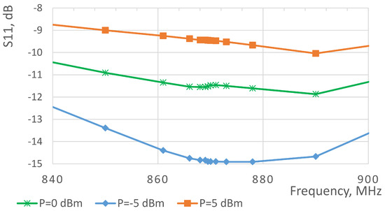 After assembling the PCB, its matching to the antenna was manually tuned. Namely, we used the Anritsu MS4623B vector network analyzer (Atsugi, Kanagawa, Japan) to estimate the input impedance and used it to calculate the matching components. Furthermore, the matching components were fine-tuned to fight the imperfections and tolerances of the components themselves, as well as to address the effects of manual component assembly. The measured reflection coefficients for the designed board are illustrated in Figure 12. We also measured the efficiencies of the designed RF–DC converter board for the different power levels—the respective results are presented in Table 4. As one can see, the performance is in the same range as that of the state-of-the-art works, discussed in Section 2. In addition, one can see that the designed board demonstrates the peak efficiency for the input signals with units-of-milliWatt power levels, which is well in line with what is needed for our application. Note that the reported measurement results were obtained having the resistive load of 9 kOhm connected to the circuit. The level of the load was selected based on the mean power consumption of the sensor node running our target application. A few iterations of the RF–DC converter design were executed to find the appropriate balance between the efficiency and the level of the output voltage, which needs to exceed the minimum threshold voltage for sensor node’s DC–DC converter.