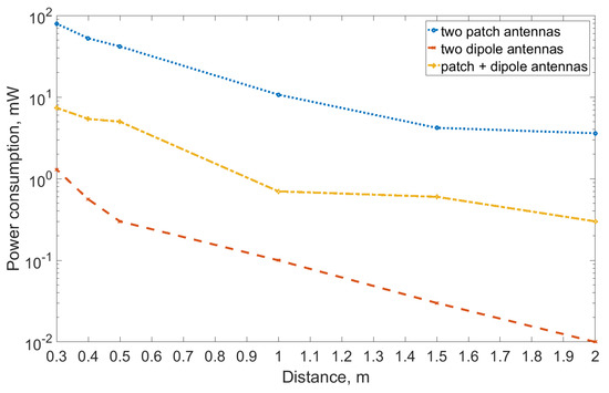 Next, we assume that both WPT transceiver and receiver antennas are omnidirectional (e.g., dipoles with 2.15 dBi gain) and that the efficiency of RF–DC conversion is 50% (refer to Table 1). In addition, we use the free-space propagation model to account for the losses in the channel. Consider that the RF energy is sent in 2.4 GHz frequency band with the maximum Effective Isotropic Radiated Power (EIRP) of 10 mW. At one meter distance, the propagation loss is in the order of 37 dB and the total harvested power is in the order of 100 W, which is below the level needed by our targeted application. Next, we consider the h1.6 band featuring 500 mW effective radiated power and 10% duty cycle limitation. At a distance of about 2.8 m, the harvested power exceeds 0.5 mW, thus enabling supplying the target device. Finally, for band g3, we can estimate that the target level of 500 W is met at a distance of about 2.5 m. The calculated maximum levels of power transferable via WPT for the different ISM bands accounting for the duty cycle restrictions are summarized in Figure 2.