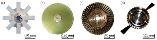 Four possible rotor geometries that can be measured using the developed system; (a) a generic steel rotor, (b) a composite rotor, (c) an industrial steel rotor and (d) a titanium disk with composite blades [15,32,33,34].