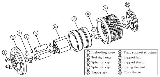 Here this concept is further elaborated and a co-rotating vibration excitation system is designed and equipped with a number of piezoelectric stack actuators uniformly distributed around the rotor axis and positioned parallel to each other, connecting two coupling halves Figure 2. The actuator arrangement allows an axial displacement of the coupling halves as well as their rotation about any transverse axis. The applied piezoelectric actuator system is particularly suitable for the intended test rotors Figure 1a due to the appropriate degrees of freedom and the possibility of high force generation in a broad frequency range. This is accomplished using three piezo-stack actuators, which are evenly distributed over a common perimeter. The power supply to the actuators is realised through a suitable high voltage slip ring.