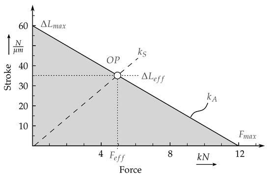 Piezo stack actuators can be applied to act as linear electromechanical drivers [35]. They are mostly used as an expanding element, which is often called a pusher, which generates a compressive force. The applied piezo stack actuators are composite structures that are made by connecting multiple piezoceramic discs with typical maximal voltages ranging from 300 V to 1000 V. The discs are made from electro-active piezoceramic material, most commonly named PZT, a material combination of lead, zirconium and titanium mixed-oxides. The complete motion cycle is almost proportional to the input of the voltage signal from the direct current up to high frequencies. Based on the dynamic requirements for the vibration and the identification of the rotor eigenfrequencies, specific actuators could be selected, that can operate in the required bandwidth. The amplitude of excitation can be controlled from the given voltage signal input. As long as the investigated structures and the applied actuators ar in the linear area, then there should be a linear dependency between amplitude of excitation and amplitude of the eigenfrequencies. Non-linear systems behave differently as they are dependent of the excitation amplitude and consequently from the resulting vibration amplitude. In this manuscript only linear systems have been in the scope of investigation. The former mentioned pre-loading of the actuators is necessary, if high frequencies or highly changing loads have to be achieved. In this case, the inertia of the actuator itself can cause cracking or delamination between several discs. Therefore, the stiffness characteristics of an actuator have to be compared to the stiffness of the pre-load via the force/stroke diagram, such as the one shown in Figure 4. For this purpose, the required maximum force and the maximum stroke on the corresponding axes are transferred into a force-stroke diagram and these points are connected via a straight line. This results in the stiffness characteristic of the actuator. The area below the straight line represents the theoretical working range of an unloaded actuator. For the determination of the suitable operating point, an origin line is entered whose slope corresponds to the stiffness of a spring load. The point of intersection of the straight line of load stiffness with the actuator stiffness characteristic marks the operating point. The frequency range of application depends on the first eigenfrequency of the actuator and the excitation range of the used amplifier. In the typical range of application for each actuator, which is normally given form the manufacturer, the force is mainly dependent from the applied voltage signal and the energy supplied.
