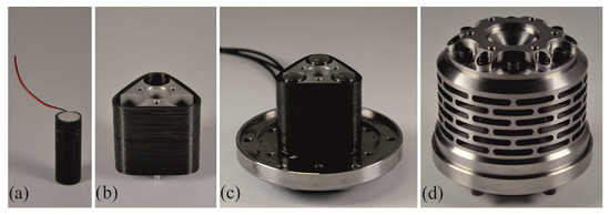 The piezo carrier as well as the piezo-stack actuators are wrapped with CFRP, shown in Figure 7c, which were wound in a wet filament winding process and cured at room temperature and tempered at 60 C. After curing of the resin and subsequent tempering, the component was demoulded and trimmed at the edges to remove unnecessary resin. In Figure 7d, the finished core component of the excitation system is shown, including the filament wound CFRP bandage and the spherical heads for the load transmission.