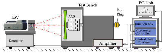 The acquisition of the vibration response was carried out by employing the POLYTEC laser scanning vibrometer (LSV) in combination with the POLYTEC optical derotator, that is shown in Figure 10. The derotator contains a Dove prism, driven by a motor allowing quasi-static measurements during rotation and is connected to an encoder that delivers a signal reporting the current speed of the driving spindle motor of the test bench. To generate the excitation, a high-voltage signal was transferred by a slip ring.