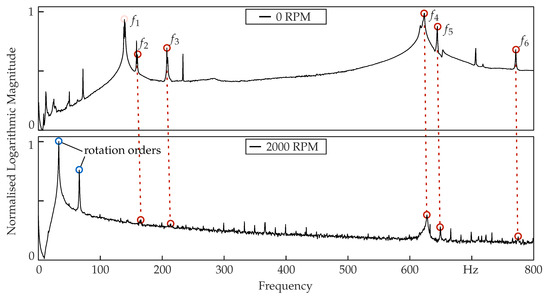 The general set-up involves the PSV-I-400 optical scanning head equipped with the highly sensitivity vibrometer sensor (OFV-505), OFV-5000 controller, PSV-E-400 junction box and the acquisition computer system. In addition, a single-point vibrometer was used to deliver a reference signal of the dynamic structural behaviour. The excitation signal was created in the PSV software and then generated and transformed by an amplifier that was driving the piezo actuators. The tests were performed under environmental conditions and under technical vacuum. During the tests, 80 measurement points were selected as shown in Figure 9b. Frequencies up to 800 Hz were measured with a resolution of 0.5 Hz. The measurements were performed at 0, 1000, 1500 and 2000 rpm. Several eigenfrequencies as well as the corresponding mode shapes were identified. The power spectral density diagrams of the generic steel rotor at two different rotational speeds are shown in Figure 11.