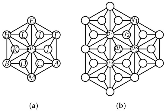 Suppose that is a neighbor of p for each and have a one-to-one mapping to , respectively. If the vertices of p and are joined with , then we obtain . It is clear that contains as a subgraph. For , we also view and collectively as .