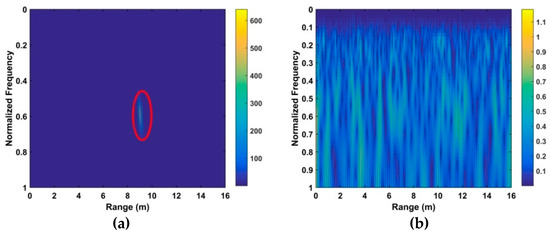 The resulting time-frequency matrix when a target is present is shown in Figure 5a and when a target is not present in Figure 5b. The VS signal is indicated in the red region. The range between the radar receiver and target can be estimated as