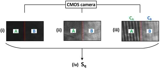 A 50:50 non-polarizing beam splitter (BS) divides the beam into an object path and a reference path. The laser light, which is linearly polarized in the y-direction (see Figure 1), is guided to a tilted plane mirror (M), in which a quarter wave plate is partly positioned and adjusted with its optical axis to on one of its halves (part B) [,]. Thus, we have two different polarization states of the reference beam after reflecting on the mirror, which allows the division of the information on parts A and B on the complementary metal oxide semiconductor (CMOS) camera. Physically, this division is like having two Michelson interferometers in the same setup, each with a different reference laser beam from the polarization viewpoint. At the same time, the light is scattered by the rough surface (RS), thus producing two speckled interference fringe patterns (A and B) on the CMOS camera. This camera (Photonfocus) has a resolution of pixels, a pixel size of and a resolution of 12 bit.