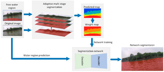 Meanwhile, the adaptive segmentation method is used to segment the image into different regions based on the similarity in color and texture. Different segmentation results are obtained by adjusting the sensitivity of two region merging. By adjusting the sensitivity of the region merging, we get multiple segmentation of the image. Then, the self-generated label and the corresponding weight map are generated according to the multi-stage segmentation and the free safe water region. Finally, the binary cross entropy loss function, which takes into consideration the diverse uncertainty in different regions, is designed to train the network. When the segmentation network is used for prediction, the conditional random field (CRF) is used to refine the network output.
