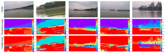 This experiment shows the process of the water region prediction. Based on the proposed adaptive segmentation algorithm, ten segmentations from fine to coarse are obtained. Based on the lidar information and the multistage segmentation result, the water region prediction map is generated by fusing maps from different stage as Equation (12), then the weight map is generated as Equation (14). Figure 5 shows the final prediction map and the corresponding weight map. The prediction maps and the weight maps are shown by the second and third row of the images, respectively.