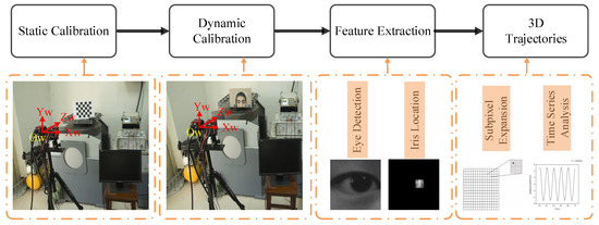 The aforementioned studies were concerned with dynamic detection, which is different from dynamic tracking. The former estimates the head posture and gaze direction at a given moment only, whereas the latter measures the movement trajectory over a period of time. Although existing methods can perform dynamic detection of the head and eyes, they cannot be used for dynamic tracking. Zhang et al. [15] used sub-pixel interpolation for visual measurement and conducted highly-accurate 3D reconstruction of vibration based on stereo vision. Baqersad et al. [16] measured the dynamic strain on a wind turbine by means of visual measurement, and Yang et al. [17] used a videometric technique to measure large-scale blade deformations. Previously, we used a binocular stereo vision system to identify the unbalanced mass of rotor systems in 3D space [18]. However, although methods already exist for tracking objects, there is an urgent need for a new method for the dynamic tracking of human eyes.