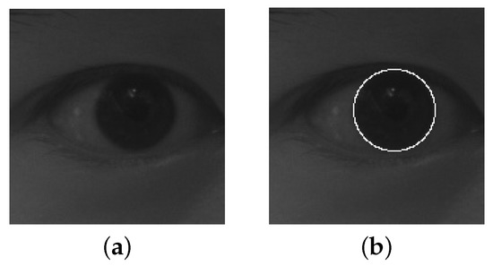 The Daugman operator is utilized to calculate the circle with the maximum pixel-value difference between the inner and outer iris edges with single-pixel precision [27,28]. Unlike the circular Hough transform, the Daugman operator gives one final result and does not require a threshold to be set. Moreover, the Daugman operator is unaffected by the average light intensity, making it more suitable for automated processing. The Daugman operator is defined as: