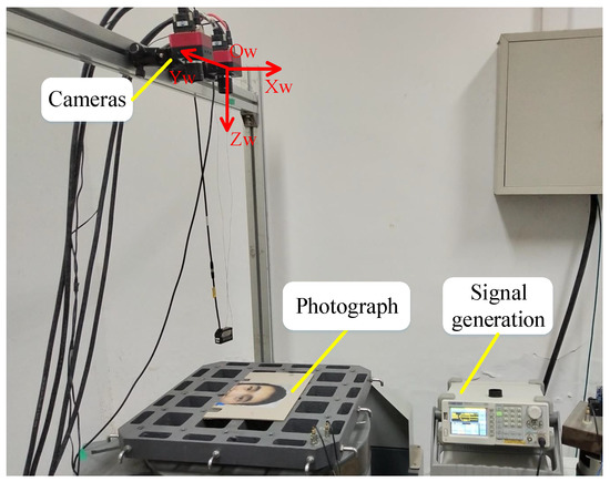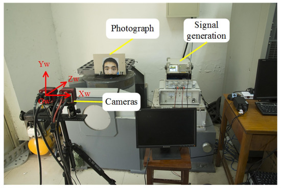 The experimental setup is shown in Figure 3. The vibration table, which was supplied by the Suzhou Testing Instrument Company, provided a standard sinusoidal motion in the vertical direction. The image acquisition system contained two high-speed cameras, two image acquisition cards, a signal generator, and a computer. The cameras were mounted on a tripod and placed in front of the vibration table so that the optical axis of the left-hand camera was perpendicular to the photograph. The signal generator produced a trigger signal to synchronize the two cameras. The laser displacement sensor that was used to detect the actual motion of the vibration table was supplied by the Micro-Epsilon Measurement Company.