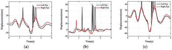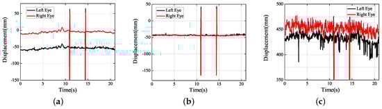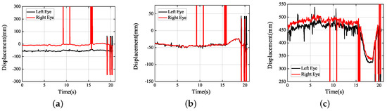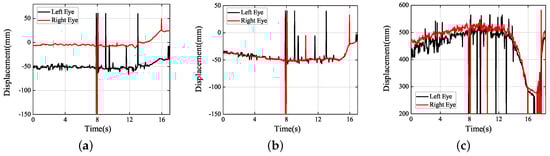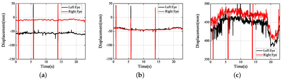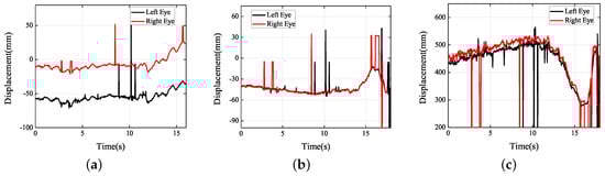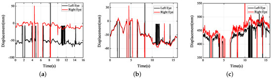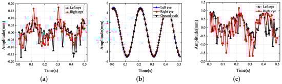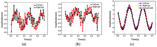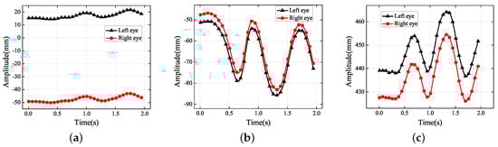 According to Figure 4b, the amplitudes of the left and right eyes in the vertical direction were respectively 5.032 and 4.844 mm, which were both very close to the ground truth of 4.932 mm; the error was approximately 0.1 mm. The vibration had small non-zero components along the X and Z axes of the world coordinate system because it was difficult to make the optical axis of the left-hand camera strictly perpendicular to the photograph. In Figure 4c, there is an amplitude of approximately 1 mm along the Z axis of the world coordinate system. Because it is easier to adjust the misalignment of the X axis of the world coordinate system, it can be seen that the amplitude in the X direction was more acceptable than that in the Z direction. Because of errors in the 3D reconstruction, the trajectories in the X and Z directions did not coincide with the standard sinusoidal curve. Although the amplitudes in the X and Z directions were not controlled to be close to zero, they were both within a reasonable range nevertheless.
