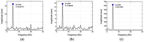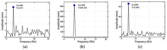 Figure 5 and Figure 6 show the frequency spectra of the left and right eyes in the X, Y, and Z directions. When the amplitude reached its maximum, the frequencies were all 4.999 Hz. Thus, the standard vibration of 5 Hz was the main factor influencing the motions in the X, Y, and Z directions. As analyzed in the previous paragraph, the standard vibrations affected the motions in the X, Y, and Z directions differently. From Figure 5 and Figure 6, it is clear that the signal-to-noise ratio (SNR) in the Y direction was the least, followed by the Z direction, and then the X direction. The images of the left and right eyes were almost identical in both the time domain and the frequency domain, thereby showing that either eye can correctly reflect the 3D trajectory of the head movement. Consequently, the present experiment demonstrated at length that the 3D eye trajectories can be reconstructed using stereo vision.