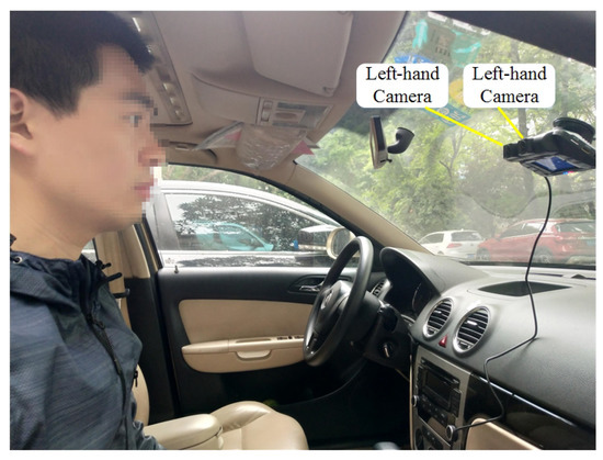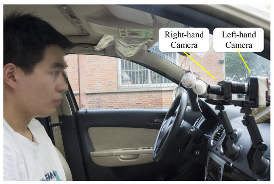 To obtain and explore the movement information of human eyes in real life, the experimental device was fitted to a vehicle. The high-speed dual cameras were fixed in front of the front passenger seat as shown in Figure 11. When the car was moving, the cameras measured the motion of the eyes relative to the car. As in the previous experiment, the world coordinate system was centered on the left-hand camera, and the optical axis of the left-hand camera was as perpendicular as possible to the eyes. The image acquisition frequency was set to 128 H,z and the acquisition time was set to 2 s, whereupon experimental research was conducted on the 3D trajectories of the eyes during the vehicle driving process. A private vehicle was used for tests on flat roads and bumpy roads, while the measured participant did not wear a seat belt and relaxed so that data could be obtained free from interference.