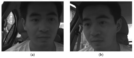 The facial images taken by the left-hand and right-hand cameras are shown in Figure 12. Visual measurements were more susceptible to the surrounding environment, and the background of the vehicle was more complicated and the ambient light stronger than in the laboratory environment. Moreover, the distance between the head and the cameras changed constantly while the vehicle was in motion, which sometimes resulted in blurry facial images. The reconstruction accuracy will be affected, and the 3D trajectories will be corrupted by incorrect results unless a stable algorithm is used.