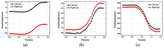 The dots in Figure 8 represent 3D reconstruction results. The results in Figure 8c were fitted with a sinusoidal curve that coincided with the standard motion. Table 3 contains the more accurate analysis data of Figure 8. The amplitudes of the left and right eyes in the Z direction were respectively 4.963 and 4.983 mm, which were both very close to the ground truth of 4.909 mm. The detection value (L) was not as good as the value (R) due to the extraction of the feature points, but it was also within an acceptable range.