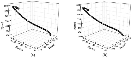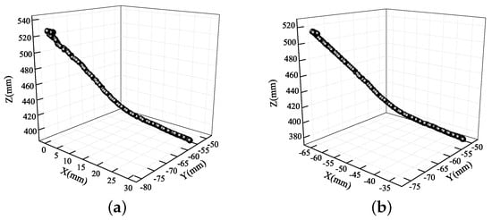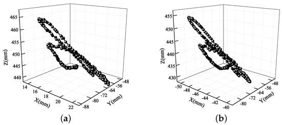 The following 3D trajectories show more detailed trajectories of both eyes. Each point in the 3D scatter diagram corresponds to a position of the eyes at different times. The 3D trajectories of the eyes during car braking are shown in Figure 14. The two trajectories were from top left to bottom right, which means that the head moved forward by approximately 140 mm, right by 30 mm, and upward by 25 mm.