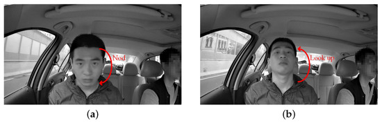 Although the previous part studied the instantaneous visual fatigue caused by acceleration speed and vibration, the driver’s head movement during fatigue driving also needs to be studied to verify that the proposed method can determine the status of the driver’s fatigue. Facial images captured by drive recorder are shown in Figure 26. According to Figure 27b, the subject had two nodding movements at 2–7 s and closed his eyes at 6–7 s. Then, he raised his head, which can be seen from the motion trajectory at 10–15 s. Experiments have shown that when the human eye moves slowly only in the Y direction and remains stable for a period of time, the subject is most likely to have a nod or a head-up action. By measuring these small movements, the proposed method can detect whether the driver is tired.