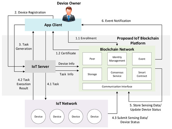 Figure 3 describes the system work flow and gives a solid understanding for each component of the proposed IoT blockchain platform. The designed platform encompasses not just a technical infrastructure but also a user service framework that exposes the distributed ledger and smart contract as services to applications. The app client provides an intuitive interface to submit transaction proposals to the blockchain network for consuming services such as user enrollment, device registration, and task generation services provided by the blockchain network. Before submitting a transaction, the enrollment is required to supply a specific participant with certificate, which contains private keys to sign the transaction. A transaction can be defined as a process of reading or writing data from the ledger that is performed among the blockchain network. The device owner can submit transaction to register a new device or generate a new task through the IoT server. In turn, the server transfers the request to the blockchain network to perform some certain operations. It can also transfer the task request from client to the device and send back collected sensing data/ status changes from the device in real time. Since the identity of the device owner is authenticated, the physical device associated with the specific owner can directly submit transactions (including owner info) to the blockchain network. The sensing data or status is then appended in the ledger and compared with the threshold defined by the smart contract. If the value exceeds the threshold level, a notification will be generated to alert the device owner.