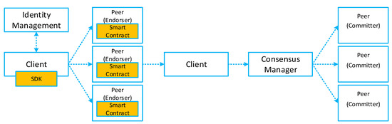 - Androulaki, E.; Barger, A.; Bortnikov, V.; Cachin, C.; Christidis, K.; De Caro, A.; Enyeart, D.; Ferris, C.; Laventman, G.; Manevich, Y.; et al. Hyperledger fabric: a distributed operating system for permissioned blockchains. In Proceedings of the Thirteenth EuroSys Conference, Porto, Portugal, 23–26 April 2018. [Google Scholar]