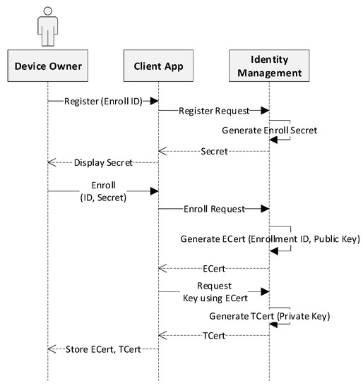 As mentioned above, the network user must have credentials before they are permitted to submit transaction proposals to the blockchain network. Therefore, the system execution procedures are classified into two sequence diagrams, respectively. Figure 6 represents the processes of identity registration and enrollment for the device owner. In order to obtain the identity, the device owner submits the registration request to the blockchain network. This request is handled by the identity management module, which issues a secret for the enrollment process through the client app. Enrollment request is then sent from the client, passing the enroll ID and secret obtained in the registration process. The identity management service passes the enrollment certificate (ECert) along with the public key for response. The ECert is used to request for the transaction certificate (TCert), and finally the TCert is returned for signing the transactions.