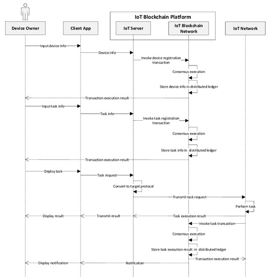 After the enrollment, the device owner is allowed to access and consume services provided by the network. Various operations happen among different components within the designed platform, which are presented in Figure 7. The device owner inputs information of the IoT device through the client application to register a new device. This information is sent along with the request and the server, in turn, invokes the device registration transaction defined by the smart contract. The consensus process is then executed in the blockchain network, where each peer appends the transaction into blockchain and stores the device information in the state database. After updating the ledger, a response is initialized to inform the client that the transaction is executed. Similarly, the device owner can generate tasks that are used for performing some operations (e.g., read temperature from the thermometer) on particular devices. The device owner can deploy a certain task to a specific device through the client. The IoT server converts the request into the specified protocol of the device and transfers the task info to that target device. The target device in the IoT network performs the task accordingly and returns the execution result (e.g., temperature value) to the server as well as to the blockchain. The execution result forwarded to the server is displayed to the device owner in the client immediately. For the other one, the execution result is packaged as a payload of the transaction and sent to the blockchain network. The blockchain network appends the task execution result to the distributed ledger of each peer and responds the execution results to the device. It also generates the notification to alert the device owner whenever the predefined condition is triggered, for example, the current temperature exceeds the threshold defined by the owner.