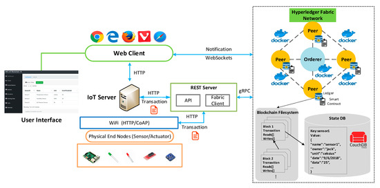 Figure 8 illustrates the implementation environment for the case study, and also presents the means of connection between the IoT devices, the server, and the blockchain network. The IoT device server is hosted on the Raspberry Pi, which is integrated with various physical sensors and actuators, that are apparent in the figure. We utilize the Hyperledger Fabric framework to construct the blockchain network, where four peers and an orderer node are running as images in the docker container. Each peer contains the smart contract and data storage to write a block of transactions to the ledger. Couch DB is used as the state database that provides rich query support and the smart contract data is modeled as JavaScript Object Notation (JSON). It supports various query methods such as get, put, and delete in conjunction with a state key, which enables the application to invoke a smart contract to access world states through simple APIs. The example in Figure 8 shows ledger states for one sensor, containing a key and a value. The Couch DB supports a simple state value with only one key-value pair, and a complex state value with multiple key-value pairs as well. In contrast to the state database, the blockchain is physically implemented in a file, as the blockchain data structure is always used to record a limited small set of simple operations. The REST server provides various RESTful APIs that expose the functions defined by the blockchain network. All these services can be invoked by either a web client or a physical device directly. It also hosts the Fabric client, which utilizes Google remote procedures calls (gRPC) system to communicate with the Hyperledger Fabric network. The blockchain acts as a transaction log that records all the state changes. Transactions are; therefore, collected into blocks that are cryptographically linked together to form a sequence of chains, where all transactions on the ledger are sorted in time order, enabling the user to know the history changes that happened in the state database. The orderer node is employed with the PBFT algorithm to ensure the consistency of every copy of the leger. This node exists independently of the peer processes and orders transactions on a first-come-first-serve basis across the network. The notification generated from the blockchain network is emitted to the client using WebSockets.