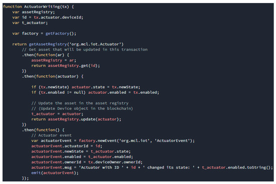 The transaction process function is the logical operation of a transaction defined in the smart contract. As shown in Figure 9, the structure of the transaction processor functions contains a JavaScript function. Here is an example, the transaction processor function relating to the actuator writing transaction is to update the status of the actuator asset. More precisely, this function replaces the status of the actuator asset with the value passed from the physical device, updates the actuator asset in the registry, and then emits an event.
