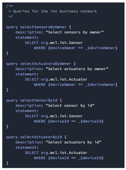 Queries are written in a bespoke query language and are defined in a single query file within a smart contract definition. By using queries, data can be easily extracted from the blockchain network. As shown in Figure 10, queries contain a description and a statement, where the query descriptions are a string that describe the function of the query and the query statements contain the operators and functions that control the query behavior.