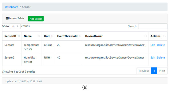 Snapshot of device dashboard. (a) Sensor dashboard; and (b) actuator dashboard.