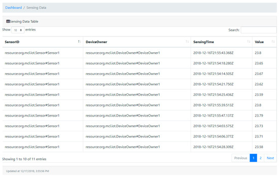 Figure 14 represents the snapshot of sensing log history in a timed sequence. Sensing time is an unalterable blockchain ledger record time indicating when the sensor reading transaction is submitted. The value presents the numerical values of readings from the physical device, in this case, this value represents the temperature value.