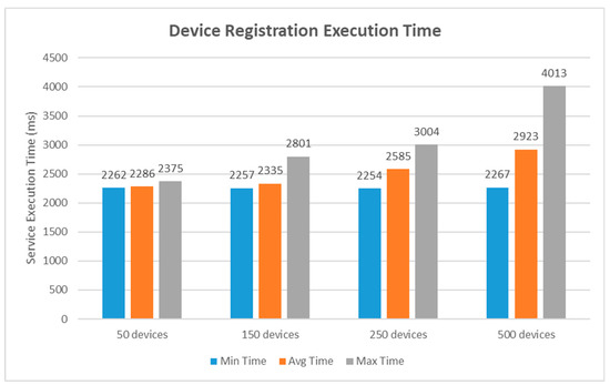 This section offers actual evaluation results to assess the performance of the proposed IoT blockchain platform. Several experimental tests were carried out using different performance metrics in order to provide a comprehensive manner. The service execution time included the time for a transaction request to be sent plus the length of time it takes for an acknowledgement to be received by the web client. For this test, we utilized the Postman, which is a tool to dissect RESTful APIs. It provides a sleek user interface to customize scripts for simulating a heavy load on network. The first study was analyzed for the service execution time cost on device registration and the results are shown in Figure 15. For this study, four groups of 50, 150, 250, and 500 devices information were provided to the proposed platform. This was implemented by using the simulation tool called Hyperledger Caliper [54], which allows users to configure the use case script of a specific blockchain implementation with a set of indicators. The execution time taken by the proposed blockchain platform to perform this transaction were recorded in minimum, average, and maximum time. For the 50-device group set, the minimum time was recorded to be 2262 ms, averaging at 2286 ms, and the maximum time was recorded to be 2375 ms. For the 150-device group set, the minimum time taken was recorded to be 2257 ms, averaging at 2335 ms, and the maximum time was recorded to be 2801 ms. For the 250-device group set, the minimum time was recorded to be 2254 ms, averaging at 2585 ms, and the maximum time was recorded to be 3004 ms. Lastly, for the 500-device group set, the minimum time was recorded to be 2267 ms, averaging at 2923 ms, and the maximum time was recorded to be 4013 ms.