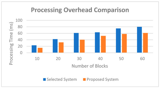 The following properties that play a pivotal role to compare the overviewed platforms are considered for this study. Additionally, it reflects the overall performance of blockchain platform and highlights the significance of our proposed approach. As shown from the table, the presented system in [43] is a somewhat similar approach, with the most similar characteristics to our proposed work. As a result, we chose to compare this system with our proposed approach. The simulation environment for this analysis was set up the same as the selected system in [43]. We simulated a network of 50 peers and ran the simulation for 60 s, during which 960 transactions were executed. The processing time metric refers to the time cost on verifying new blocks in the network. Simulation results for evaluating the processing overhead are presented in Figure 18. As shown in the graph, the processing overhead with our approach was lower than the selected system by varying the number of blocks from 10 to 60. In general, our approach decreased the processing time by 22%.