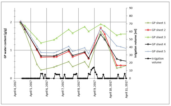 An example of germination paper (GP) water content behavior in sheets with an identical irrigation treatment.