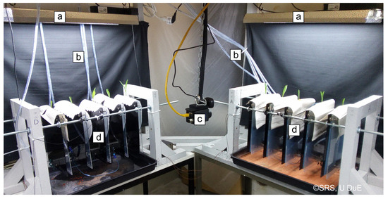 Partial view of the test rig. Two out of four test groups are shown. (a) Artificial illumination; (b) Irrigation tubes; (c) Infrared camera (not relevant in this work); (d) Test group of five specimens each consisting of a Perspex frame, GP, and a corn plant.