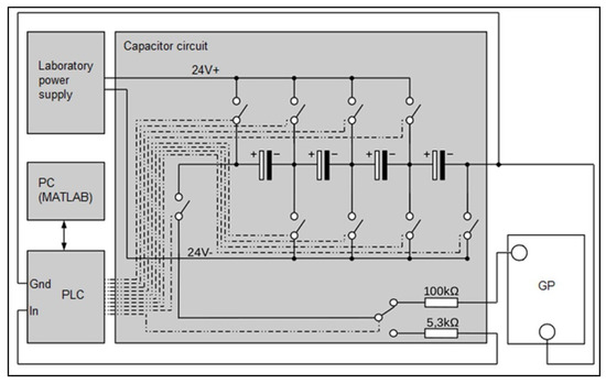 The system for the measurement of GP water content is described in Zimmermann [9]. An electric circuit as described in Hering [8] was implemented. Four capacitors (6300 F ± 20% each) were connected in a series to facilitate a higher operating voltage as well as to increase the range of measurable resistance. The capacitors were connected to multiple relays, two resistors (100 k± 5%, 5.3 k± 10%), a laboratory power supply, and a programmable logic controller (PLC) (ifm CR0403). In Figure 3, the circuit for one sheet of GP is exemplarily shown. For simplification, the relays are drawn as switches connected to the PLC. Connections are denoted by chain-dotted lines. The measurement is realized using the PLC, which is connected to a PC via CAN-BUS. Every measurement is saved on the PC with a time stamp.
