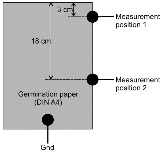 The water content of 8 out of 20 GP sheets (two in each group) was measured successively. A single measurement lasted 15 min and the sampling time was 2 h. Two characteristic curves for the calculation of GP water content from the measured remaining charge were derived for two different positions as shown in Figure 4. The capacitor circuit was discharged through the GP between the indicated measurement positions and the ground. Only one measurement position was connected at a time.
