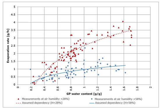 is based on the assumption that the evaporation depends on the GP water content. Preliminary tests showed a logarithmic dependency between the water content of GP and the rate of evaporation shown in Figure 6. This is consistent with a previously documented relationship between evaporation and soil water depletion [12]. Measurements were carried out gravimetrically using a precision balance. The two curves show the assumed dependencies between evaporation and GP water content. From these results, a strong (and formalizable) dependency on air humidity can be assumed.