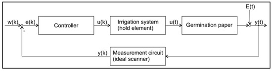 The control loop for GP water content control is shown in Figure 8. The irrigation element was assumed as a zero order hold element. The measurement circuit was assumed as ideal. The evaporation was considered as a disturbance variable acting directly on the output.