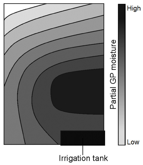 Drying out the GP from saturation and evaluation of the water distribution indicated greater evaporation from the corner samples. This was due to a greater exposure to the environment at the frame boundary. Similarly, the left edge (Figure 9) experienced greater exposure to the atmosphere as a result of facing the interior of the greenhouse. This is assumed to be the reason for the left-right gradient of water distribution obtained. Gravitational effects would also contribute to faster loss of water from the topmost sections.